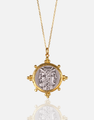 **"Janus Duality Pendant Necklace"** features the two-faced Roman god Janus, encased in an ornate golden frame, symbolizing transitions, balance, and timeless elegance.