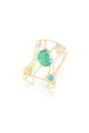 Indulge in luxury with our Aurora Gemstone Cuff. This exquisite piece boasts a delicate openwork gold design embellished with vibrant, hand-set gems, creating a one-of-a-kind accessory. A radiant statement of sophistication and artistry. Keep its beauty intact by avoiding harsh chemicals and long-term or heavy use.
